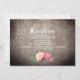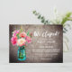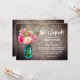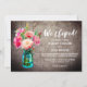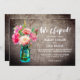 Det här rustika murbrukskruk med blommor vigselreception inbjudningskort är perfekt för en blomsterrik country-inspirerad vigselceremoni. Designen visar en elegant komposition av rosablommiga akvarell-peonior och vilda blommor i en blå murbrukskruk på en trästrukturerad bakgrund. RSVP-kort säljs separat.