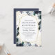 Eleganta marinblå bröllopsinbjudningar med en trendig vit bakgrund som kan ändras till valfri färg, rustika boho blå vattenfärg blommor, en guldgeometrisk ram, guldglitter och en modern bröllopsmall.