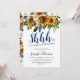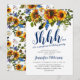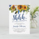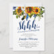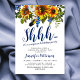 Boho navy & gul överraskningsfödelsedagsinbjudan med en klassisk vit bakgrund som kan ändras till valfri färg, en akvarellsolsäck floral display, fjädrar och en elegant födelsedagsfirande inbjudan mall.