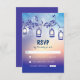 Vackra, rustiska landsbyggsbröllopet svarar kort med trädgårdsodling ljus - oljeflyktor som hänger på grenar i det gamla träd. Perfekt blå bröllop har svarskort för sommarbröllop, vår, höns- eller vinterbröllop. Kreativ och modern utformning för bröllop-teman utomhus.