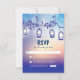 Vackra, rustiska landsbyggsbröllopet svarar kort med trädgårdsodling ljus - oljeflyktor som hänger på grenar i det gamla träd. Perfekt blå bröllop har svarskort för sommarbröllop, vår, höns- eller vinterbröllop. Kreativ och modern utformning för bröllop-teman utomhus.