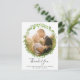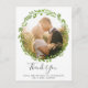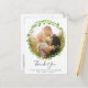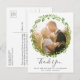 Rustik bryllop tack-kort med ditt foto inuti en grön olivkrans. Ditt meddelande och namn är nedan i en medelgrå font. Denna design är bra för en sommarbryllop.