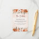 Dessa vackra och romantiska bröllopsdetaljer informationskort för gäster har en trendig boho-stil och elegant burgunder kalligrafi. Rustika bohemiska buketter av orange, persika, rosafärgad och taupe blommor och neutrala botaniska blad pryder toppen och botten, med matchande subtila vattenfärgssprut på en mjuk rosafärgad bakgrund.