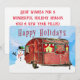 En bedårande rustik vintage husvagn i glada höstfärger står i en rolig snöig miljö. De söta fönstren lyser med tända höstljus. En krans och en klarröd rosett pryder husvagnens framsida. Röda och vita gardiner pryder fönstren. En snöman med toppmössa och halsduk står bredvid husvagn. En vacker blå himmel med fluffiga moln fullbordar den underbara vinterscenen. "Happy Holidays" i bär-röda bokstäver står ovanför husvagnen. Texten på baksidan lyder: "Best wishes for a wonderful holiday season and a new year filled with love and amazing adventures". Greetings-kortet går enkelt att ändra om du önskar. Det finns även en mall för ditt namn på baksidan.