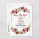 En elegant men rustik blomster-"Spara datum"-anmälningskort. Illustrationen har rosa och vinröda rosor med grönska i en ram. Baksidan har en matchande brölloppsgrafik. Kalligrafin kan anpassas med ditt val av ord, teckensnitt och formatering.