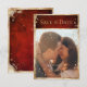 Ett vackert foto bröllop ”Spara datum” -kort till alla era familjemedlemmar och vänner för att artigt inbjuda dem till er speciella tillställning. Den scharlakansröda rustika bakgrunden ger en så rik look. Beskuren i falskt guld glitter för att sätta tonen för romantisk och klassisk elegans. Guldstänk fullbordar denna söta bröllops ”Spara datum”-lapp. Vacker för alla årstider.