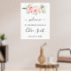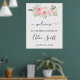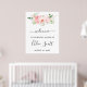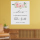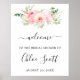 Eleganta rosablommiga påskliljor är boende i gröna blad. Välkommen är skrivet med ett trendigt typsnitt. Brudens namn är också i ett populärt typsnitt. Den öppna och luftiga texten kompletterar den mjuka blomsterpaletten. Denna välkomstskylt för bröllopsfest är en del av kollektionen Rustik Rosa Påsklilja.