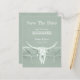 Denna rustika spara datum bröllopsinbjudan vykort har en västerländsk tjur skalle pastell saggrön vit country vintage antik distressed textur cowboy stil design. Använd lite humor med denna söta, roliga farmhouse inspirerade inbjudan. Gammal vilda västern, unik, cool, trendig gård djur. Anpassa skript och typografi. Bild copyright Marg Seregelyi Photography.
