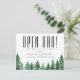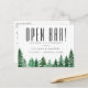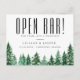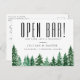 Rustika akvarell gröna skogsträd, bröllop spara datum vykort. Kortet har rolig "ÖPPEN BAR!" på framsidan med elegant kalligrafi "Spara Datum" på baksidan.