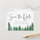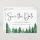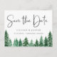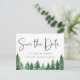 Rustika gröna skogsträd i vattenfärg, bröllop spara datum vykort. Kortet har elegant kalligrafi "Spara Datum", på fram- och baksidan.