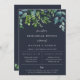 Rustika vattenfärgsskompositioner med skogslöv i olika nyanser av grönt och blått, inbjudan till repetitionsmiddag. Chic och modern typsnittsdesign. Bakgrunden har en solid mörk marinblå färg.