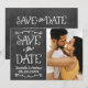 Whimsical och unik tvåsidig fotoannonseringskort save the dates har en rustik texturerad look svart tavla bakgrund med handskrivna typsnitt som har ett vitt kritutseende. Anpassa med bröllopsdetaljerna och ett favoritporträttformat förlovningsfoto.