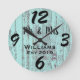 Vacker, unik, enastående, vintage, rustik, slitna designdetaljer med en sliten rustik gammal aquablå träskiva med svarta, feta siffror på en tryckt träliknande bakgrund. Vilken elegant, rustik accessoar för ditt vardagsrum, sovrum eller familjerum. Personalisera denna klocka genom att lägga till din personliga information. Gör en fin bröllops-, årsdags- eller inflyttningspresent. Klicka på "personalisera denna mall" för att ändra namn, teckensnitt och färger för att skapa en unik enastående design. Om du behöver hjälp med anpassningen, vänligen maila mig på ybnormalone@gmail.com. Tack för att du besökte www.zazzle.com/Personal_Creations. ©Karen Hall för Personal_Creations på Zazzle.