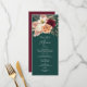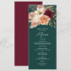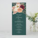Elegant blomsterbröllopsmeny med romantiska akvarellblommor i vinrött, persika och elfenben på en djup smaragdgrön bakgrund. Perfekt för rustika, boho eller höstbröllopsreceptioner. Anpassa med dina egna rätter, parets namn och bröllopsdatum. För hjälp eller anpassade redigeringar, maila bpkolman@gmail.com