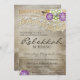 Rustic Snöre Distress Möhippa Inbjudan. Ett mycket klassligt och rustiskt shabby chic-inbjudningskort för möhippan med olika grönt- och krämblommor med metall-förnimmelser i dem och runt dem, pärlor som inslag skonar toppen och grund och finare Victorian snöre och en fågel på gren, bär upp denna inbjudan ovanpå en rustisk brun bakgrund. En underbarare, rustik Vintage Snöre Distressad Inbjudningskort för möhippan för den strupen eller vintage bröllop och dessa inbjudningskort är budgetvänliga, men se fantastisk!