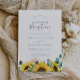 Den här lantliga solros-eukalyptusbröllopsinbjudan är perfekt för en landlig efterfest efter vigseln. Den bohemiska blomsterdesignen har gula solrosor, rosablommor och jägargreen eukalyptusgrönska i akvarell med en elegant modern boho-känsla. RSVP-kort säljs separat, eller så kan du lägga till RSVP-information på baksidan av kortet.