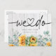 Rustik akvarell solros och eukalyptus på träsnitt vigselkort förhandsavisering vykort som säger "vi gör" med sammankopplat hjärta. Personlig information på baksidan.