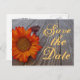 Den här designen innehåller ett foto av en solrosvilande orange på trä, med en rustisk snyggt "Spara datum". Anpassa den andra sidan med namn, datum och plats för brudgummen och brudgummen. Om du vill ändra teckensnittsknappen klickar du på stilarna Anpassa.