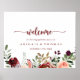 Denna rustika sommarblommiga förlovningsfest välkomstplansch är perfekt för en modern förlovningsfirning. Designen har burgunder, rosa och rosafärgade akvarellblommor med gröna blad på en brunaktig bakgrund.