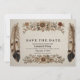 Denna eleganta bild är ett vintage-inspirerat kort med frasen "SPARA DATUM" i en enkel serif-typsnitt. Texten är inramad av detaljerade, handritade illustrationer av blommor, blad och stora fjädrar i jordnära toner. Den övergripande rustika och bohemiska designen är perfekt för en bröllops- eller speciell evenemangsinbjudan. Fyll i dina detaljer för din speciella dag.