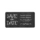 Den vita och unika adressetikettdesignen har "Spara datum" i ett handskrivet teckensnitt, anpassningsbarnas returadress och en skisserad rulla och hjärtdesign i inslag. Mjuk svart brädesbakgrund i stil med ett strålande texturerat utseende och vitt krita i färg. Större etikett fungerar bra som en försegling för kuvertets baksida.