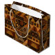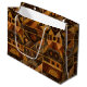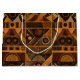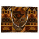 Varm geometrisk randmönstrad presentpåse med stammestil-inspirerade diamanter, sicksackmönster och texturerade vertikala band i jordnära bruna, terrakotta-, tan-, beige- och kolgrå toner. En mysig boho-design som är idealisk för älskare av sydvästlig inredning, fans av rustik stil och alla som dras till jordnära, handgjorda estetiken.