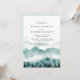 Elegant och rustik bröllopsinbjudan med akvarell berg med träd och brudens och brudgummens initialer på baksidan.