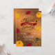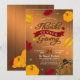 Rustik inbjudan till Thanksgiving middag med skogig brun bakgrund, röda och orange höstlöv, festlig kalkon, orange pumpor och gnistrande detaljer.