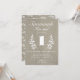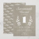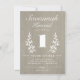 En rustik inbjudan till barnets första födelsedagsfest med barnets namn och ålder i stort, omgivet av handritade lagergrenar på en vit ek trästruktur bakgrund. På baksidan av inbjudan finns ett koordinerande lagergrenmönster.