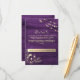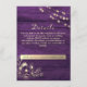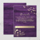 Elegant, modern, rustik trä lila bröllopsdetaljkort med webbplats, guldgildad blomsterbroderi och strängljus.