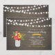 Fira din speciella dag med denna stilrena överraskningsfestinbjudan. Denna design har strängljus, höstblomsterbukett med en masonburk på en rustik trädgårdshackgrund. Färgpaletten är gul, korall och röd. Du kan anpassa texten till alla evenemang.