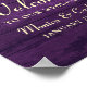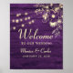 Elegant, modern, rustik bröllopsaffisch i lila med guldblommig spets, strängljus och trendig kalligrafi på trä från lada.