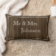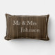 Skapa din egen par-kudde med era namn och bröllopsdatum i vackra vita skrivstilbokstäver på en mörk rustik trähuvud. Stilfull och elegant och gör en fin present till bröllop, årsdagar eller jul.