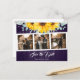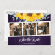 Rustik lila och solros bröllopsfoto spara datum kort med en fotokollage med akvarell solrosor och grönska mot en ladugård trä bakgrund.
