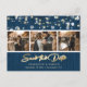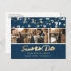 Personligt utformat rustika marinblå och guldbröllopsfoto spara datum-kort med en fotokollage av 3 bilder mot en rustik marinblå träbakgrund prydd med strängljus. Anpassa enkelt detta rustika marinblå fotobrevkort med dina bilder och bröllopsdetaljer, inklusive en bröllopswebbplats om du önskar. För anpassade förfrågningar, vänligen skicka oss ett meddelande.