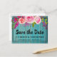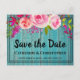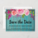 Detta vackra rustika Spara Datum-kort har en blå träbakgrund med trendig typografi dekorerad med en ros vattenfärg blommig bukett med gröna blad. Anpassa typsnitt och färg på texten efter eget tycke.