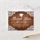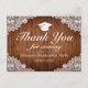 Examens tack-kort. Rustik stil med bruna träplankor bakgrund och vit spets dekoration.