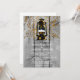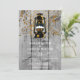 Rustik grå ladugårdsträ bryllup med en väderbiten träpanel bakgrund med en söt lykta med en målad landskap på den, och en stänk av konfetti. Baksidan av inbjudan är en jordnära, mjuk grön nyans, och en vacker kontrast.