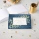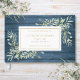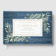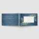 En rustik personlig fest för livet, begravningsgästbok med grönska på en blå träpanel bakgrund. Designad av Thisisnotme
