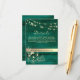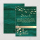 Elegant, rustik trä smaragdgrön brölloppsdetaljkort med webbplats, vintage guld blomsterbroderi och strängljus.