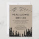 Denna rustika träiga mottagningsinbjudan för bergbröllop är perfekt för en skogsparty efter bröllopet. Den naturinspirerade designen visar siluetten av en tallskog och berg på falskt kraftpapper. RSVP-kort säljs separat.