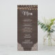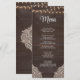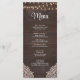 Tillsätt en touch av rustik charm på ditt bröllopsfirande med vårt Rustika Träljus Meny Kort. Denna vackert designade meny har en brun rustik trädgård bakgrund prydd med ömtåliga strängljus och ett spetsmönster högst upp. Det anpassningsbara menyavsnittet låter dig anpassa den med ditt urval av rätter och drycker.