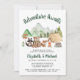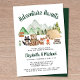 Söt rustik par baby shower inbjudan med en söt illustration av skogs djur (en björn, räv och tvättbjörn) med sitt tält och lägereld camping i bergen och skogen och "Äventyr Väntar" och namnen på mamman och pappan i ett mörkgrönt manus.