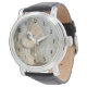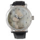 En klocka med ett foto av en söt stoppad björn, som står vid en rustisk trävägg/bakdel.