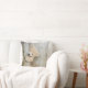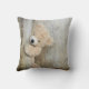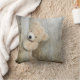 En kudde med ett foto av en söt stoppad björn, som står vid en rustisk trävägg/bakdel.
