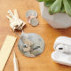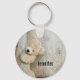 En nyckelring med ett foto av en söt stoppad björn, som står vid en rustisk trävägg/bakdel.