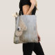 Tote-väskan med ett barnfoto av en söt stoppad björn som står vid en rustisk trävägg/ryggdroppe.