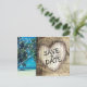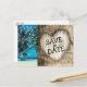 Exotiska tropiska "save the date"-kort med en sommarstrandmiljö, stränglyktor och ett rustikt palmerträd med ett snidat hjärta med detaljer om er bröllpsdag.