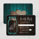 Personliga turkos rustika murar glas bröllop RSVP-kort med en murar glas och två säckvävshjärtan med initialer mot en rustik träd bakgrund. Anpassa enkelt online.