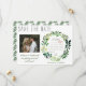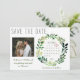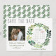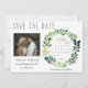 Låt vänner och familj veta att du gifter dig med dessa enkla vattenfärg-förhandsinbjudan kort. Designen har rustik typografi och en handmålad vattenfärgs girlang av grönt lövverk. En bedårande bild av det lyckliga paret lägger till en speciell touch, liksom den personliga kalendern. Perfekt för ett vår- eller sommarbröllop.